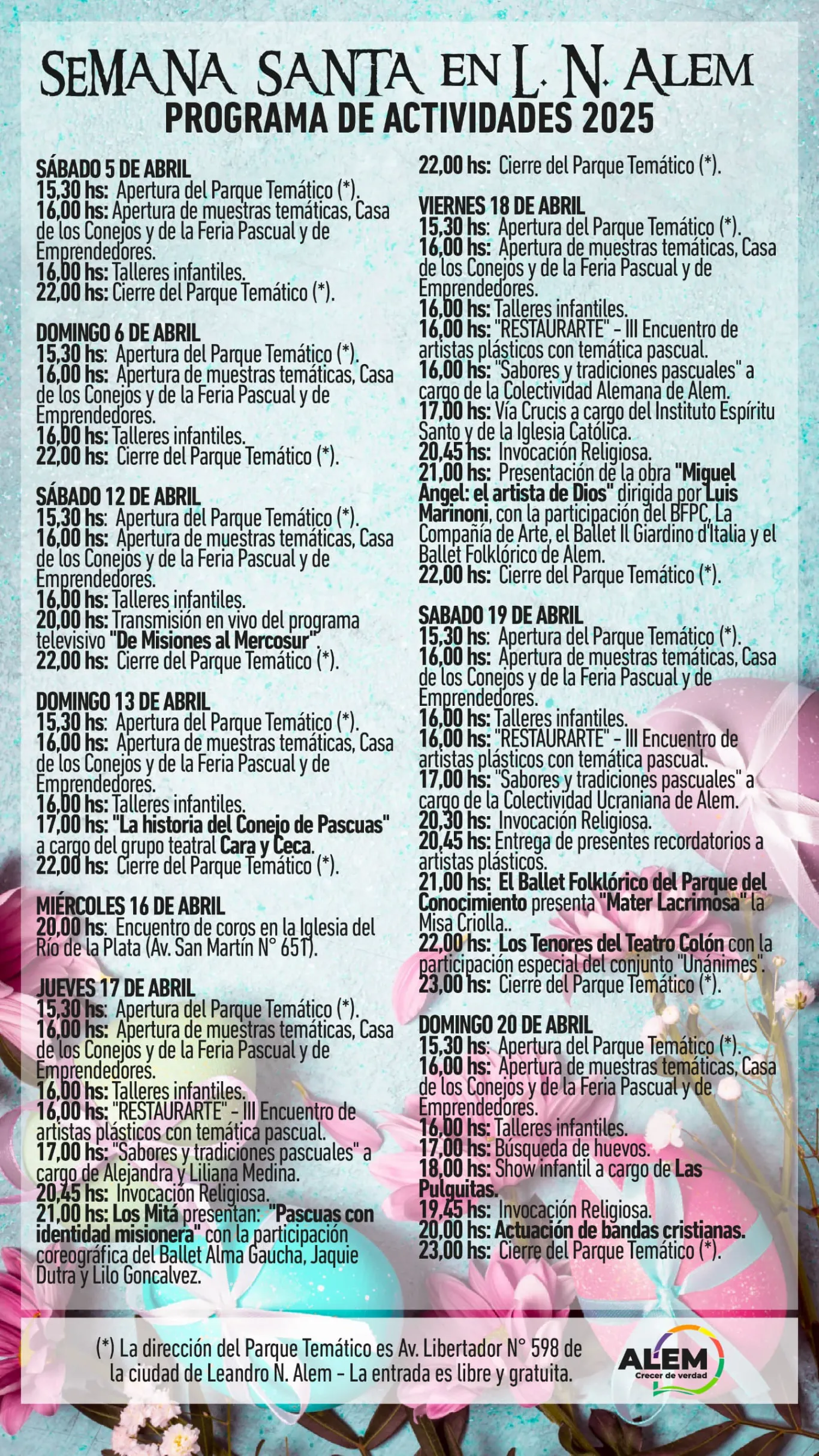 Todos los años durante la época de Semana Santa, Leandro N. Alem ofrece variadas actividades que se desarrollan en su Parque Temático de Av. Libertador N° 598. En ese espacio de 4 hectáreas -rodeado de vegetación y antiguas edificaciones históricas de singular belleza- los visitantes pueden encontrar: feria de artesanías, gastronomía, shows artísticos, muestras religiosas que reviven la pasión y muerte de Jesús, talleres pascuales para la elaboración de huevos, canastas y tarjetas, y una alegoría infantil para los más pequeños que pueden visitar la “Casa de los Conejos”.