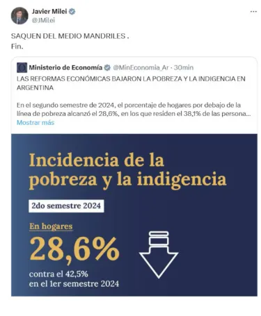 “La pobreza sin precedentes que había dejado el gobierno de Alberto Fernández, Cristina Kirchner y Sergio Massa, que llegó a un pico del 52,9% en la medición del primer semestre de 2024, se redujo al 38,1% en el segundo semestre, mientras que la indigencia disminuyó del 18,1% al 8,2%, como efecto directo de la lucha contra la inflación que ha llevado adelante el Presidente Javier Milei, además de la estabilidad macroeconómica y la eliminación de restricciones que durante años limitaron el potencial económico de los argentinos”, indicó un comunicado de la Oficina de Presidencia tras la información del Indec.