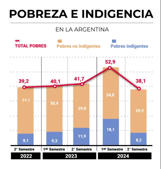 La indigencia, es decir la porción de la sociedad que no logra tener cubiertos los gastos de canasta básica alimentaria, fue en el final del 2024 de 8,2 por ciento. Esto implicó un retroceso respecto al primer semestre de ese año (18,1%) y al fin de 2023 (11,9 por ciento).